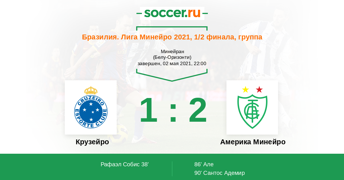 Бразилия. Лига Минейро 09.05.2021 Америка Минейро Логотип футбольный клуб Америка Минейро (Белу-Оризонти) 3:1 Логотип футбольный клуб Крузейро (Белу-Оризонти) Крузейро