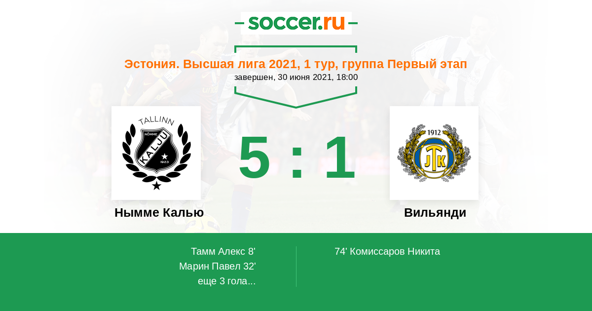 Эстония. Высшая лига 12.06.2018 Нымме Калью Логотип футбольный клуб Нымме Калью (Таллин) 8:2 Логотип футбольный клуб Вильянди Вильянди