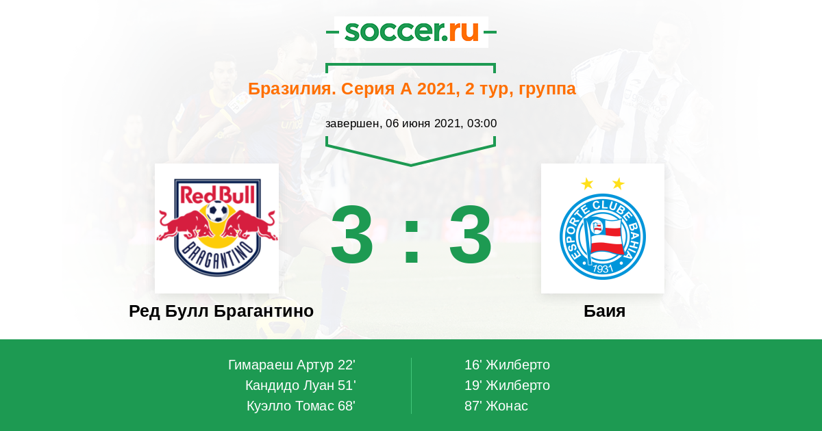 Бразилия. Серия А 19.09.2021 Баия Логотип футбольный клуб Баия (Салвадор) 1:1 Логотип футбольный клуб Ред Булл Брагантино (Браганса-Паулиста) Ред Булл Брагантино