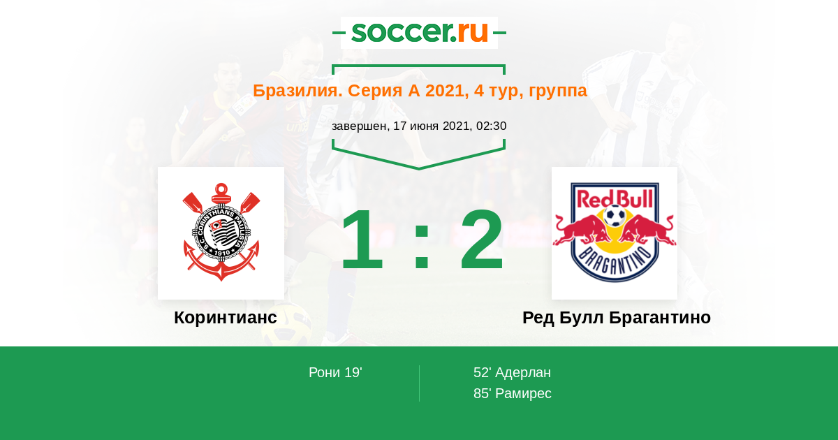 Бразилия. Серия А 26.01.2021 Коринтианс Логотип футбольный клуб Коринтианс (Сан-Паулу) 0:2 Логотип футбольный клуб Ред Булл Брагантино (Браганса-Паулиста) Ред Булл Брагантино