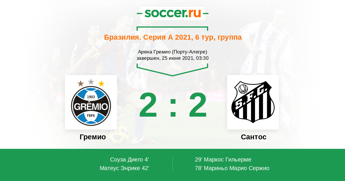 Бразилия. Серия А 03.02.2021 Гремио Логотип футбольный клуб Гремио (Порту-Алегри) 3:3 Логотип футбольный клуб Сантос (Сан-Паулу) Сантос