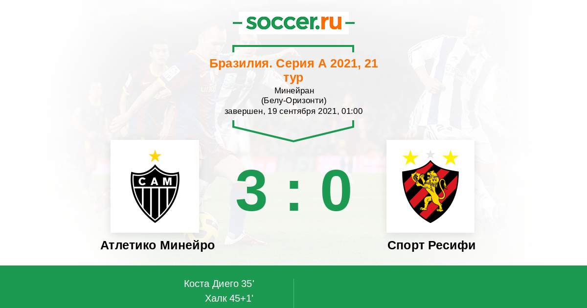 Бразилия. Серия А 21.02.2021 Спорт Ресифи Логотип футбольный клуб Спорт Ресифи 2:3 Логотип футбольный клуб Атлетико Минейро (Белу-Оризонти) Атлетико Минейро
