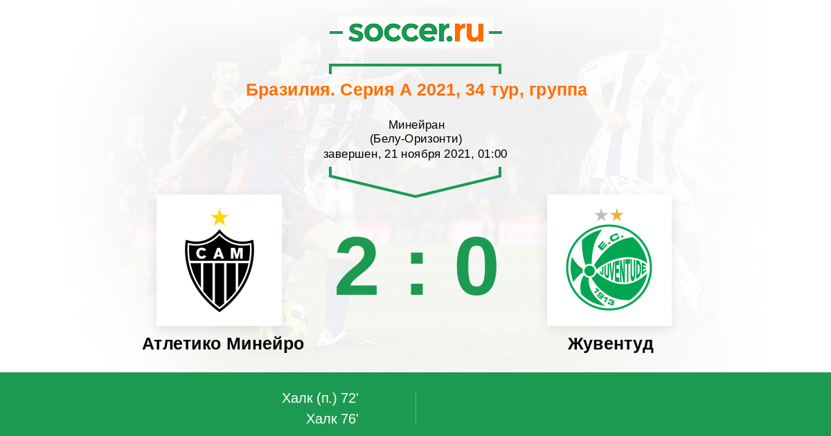 Бразилия. Серия А 08.08.2021 Жувентуд Логотип футбольный клуб Жувентуд (Кашиас-ду-Сул) 1:2 Логотип футбольный клуб Атлетико Минейро (Белу-Оризонти) Атлетико Минейро