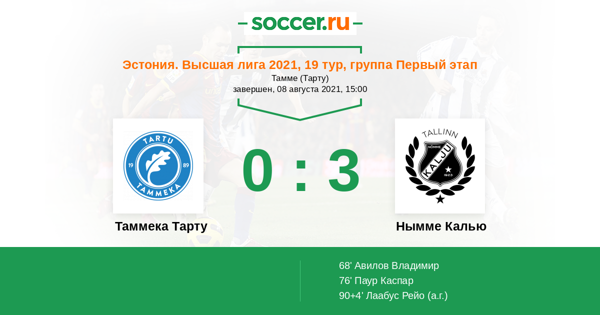 Эстония. Высшая лига 21.08.2010 Таммека Тарту Логотип футбольный клуб Таммека Тарту 0:1 Логотип футбольный клуб Нымме Калью (Таллин) Нымме Калью