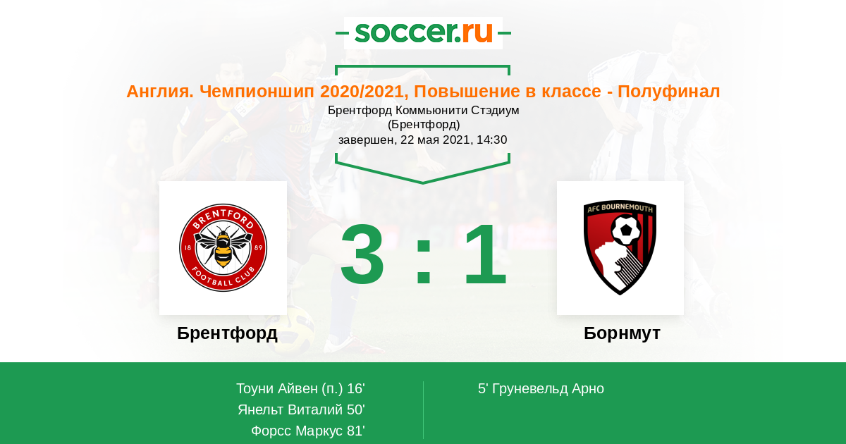Англия. Чемпионшип 17.05.2021 Борнмут Логотип футбольный клуб Борнмут 1:0 Логотип футбольный клуб Брентфорд (Лондон) Брентфорд