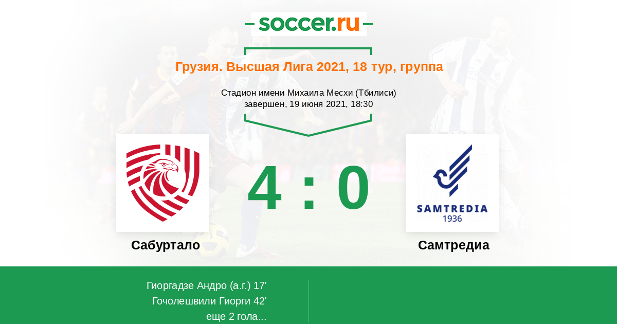 Грузия. Высшая лига 29.09.2021 Самтредиа Логотип футбольный клуб Самтредиа 0:2 Логотип футбольный клуб Сабуртало (Тбилиси) Сабуртало