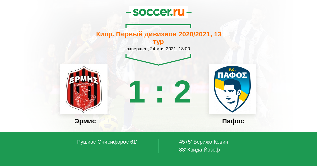 Кипр. Первый Дивизион 22.02.2021 Пафос Логотип футбольный клуб Пафос 3:1 Логотип футбольный клуб Эрмис (Арадиппу) Эрмис