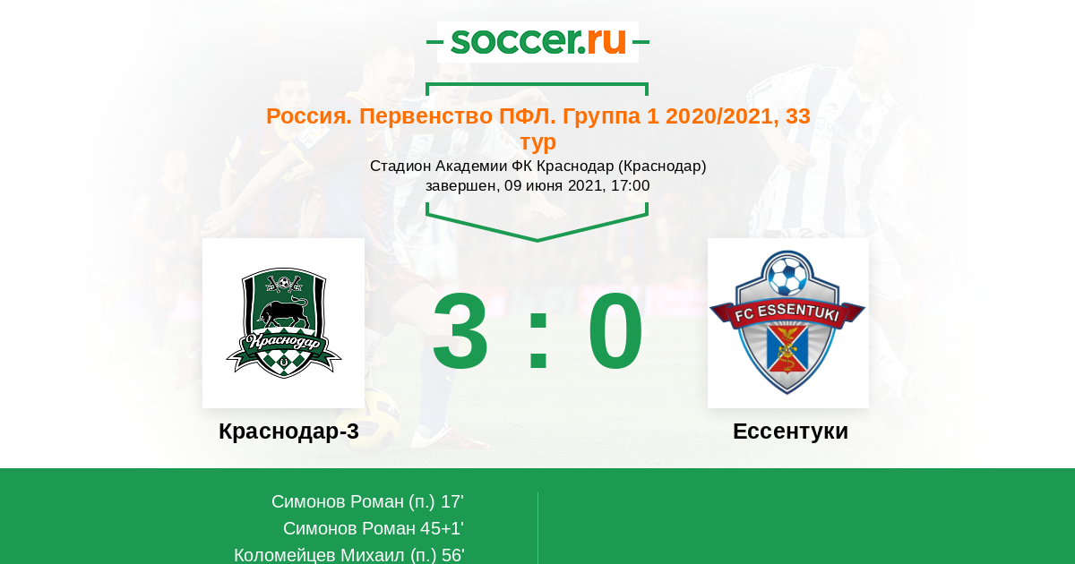 Россия. Вторая лига. Группа 1 09.06.2021 Краснодар-3 Логотип футбольный клуб Краснодар-3 3:0 Логотип футбольный клуб Ессентуки Ессентуки