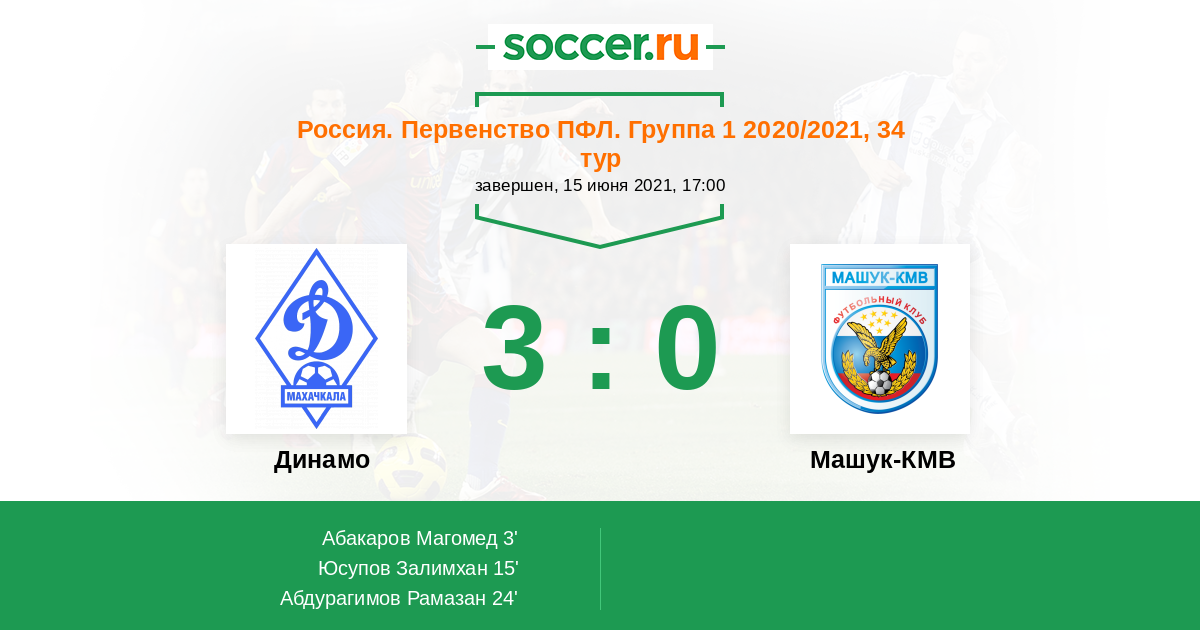 Россия. Вторая лига. Группа 1 17.10.2021 Динамо Логотип футбольный клуб Динамо (Махачкала) 2:1 Логотип футбольный клуб Машук-КМВ (Пятигорск) Машук-КМВ