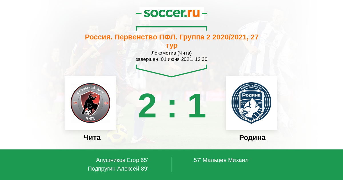 Россия. Вторая лига. Группа 2 01.11.2020 Родина Логотип футбольный клуб Родина (Москва) 3:0 Логотип футбольный клуб Чита Чита