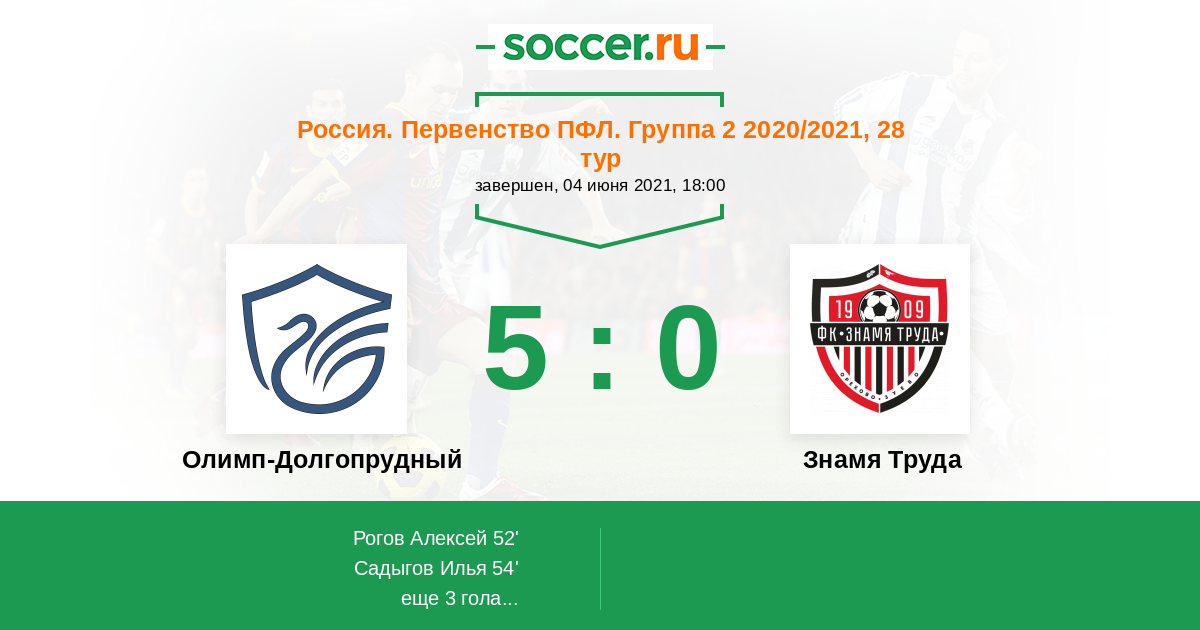 Россия. Вторая лига. Группа 2 25.10.2020 Знамя Труда Логотип футбольный клуб Знамя Труда (Орехово-Зуево) 0:1 Логотип футбольный клуб Олимп-Долгопрудный Олимп-Долгопрудный