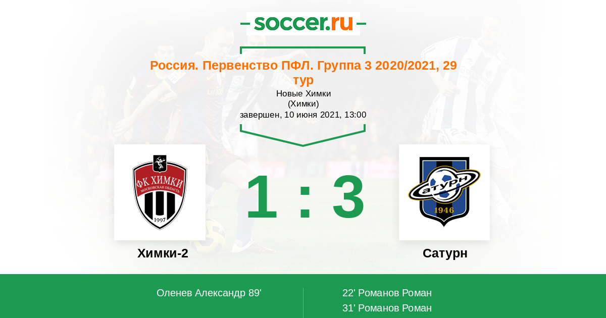 Россия. Вторая лига. Группа 3 29.08.2021 Сатурн Логотип футбольный клуб Сатурн (Раменское) 1:1 Логотип футбольный клуб Химки-2 Химки-2