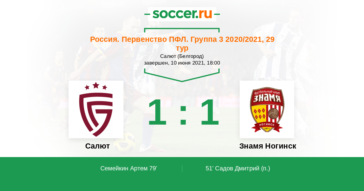Россия. Вторая лига. Группа 3 08.11.2020 Знамя Ногинск Логотип футбольный клуб Знамя Ногинск 0:1 Логотип футбольный клуб Салют (Белгород) Салют