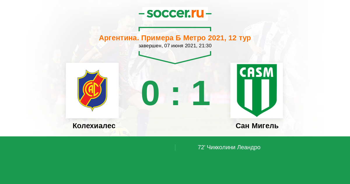 Аргентина. Примера Б Метро 02.10.2021 Сан Мигель Логотип футбольный клуб Сан Мигель 0:2 Логотип футбольный клуб Колехиалес (Висенте Лопес) Колехиалес