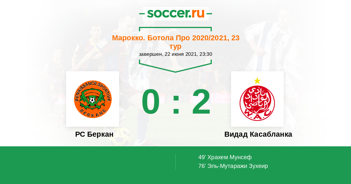 Марокко. Ботола Про 23.11.2021 Видад Касабланка Логотип футбольный клуб Видад Касабланка 2:0 Логотип футбольный клуб РС Беркан РС Беркан
