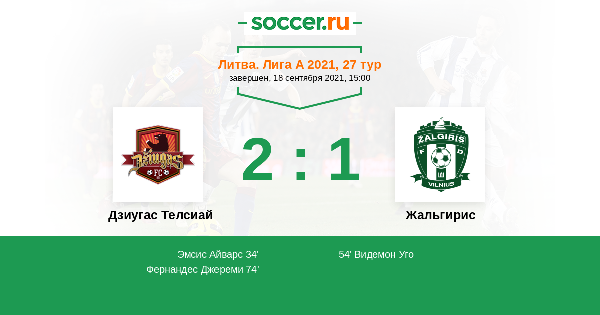 Литва. Лига А 28.11.2021 Жальгирис Логотип футбольный клуб Жальгирис (Вильнюс) 3:2 Логотип футбольный клуб Дзиугас Телсиай (Тельшай) Дзиугас Телсиай