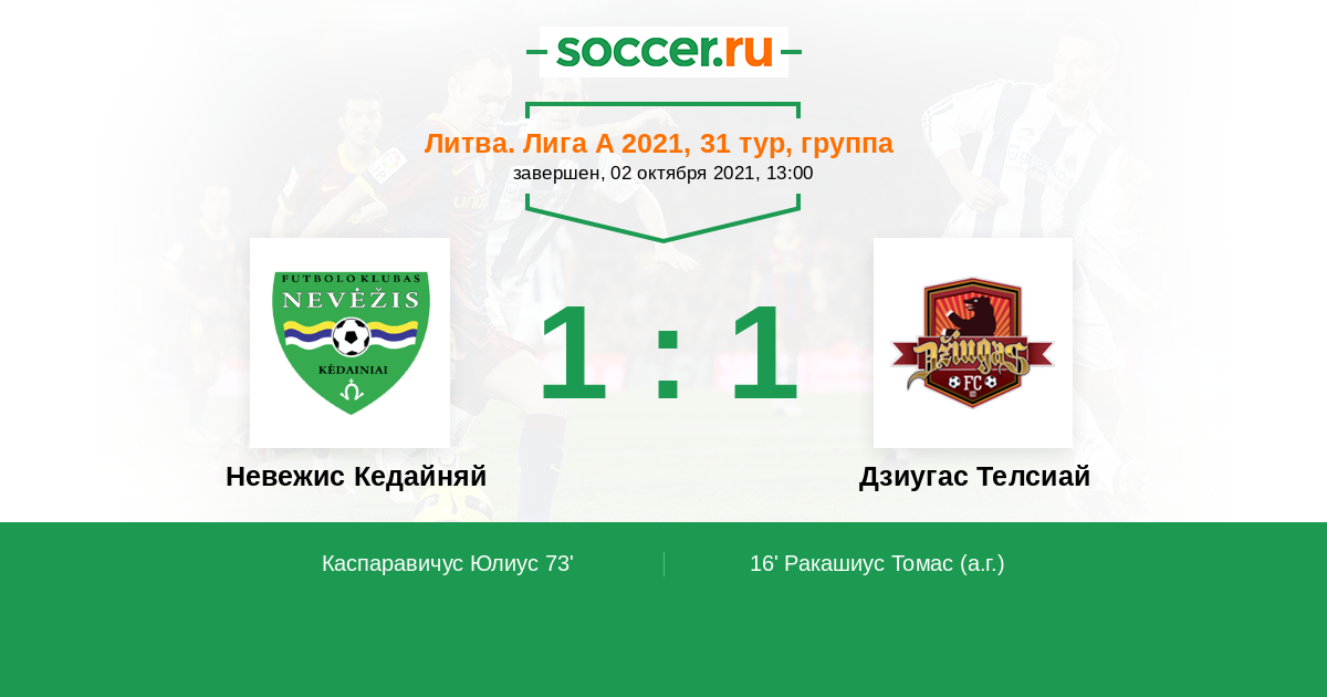 Литва. Лига А 06.08.2021 Дзиугас Телсиай Логотип футбольный клуб Дзиугас Телсиай (Тельшай) 2:0 Логотип футбольный клуб Невежис Кедайняй Невежис Кедайняй