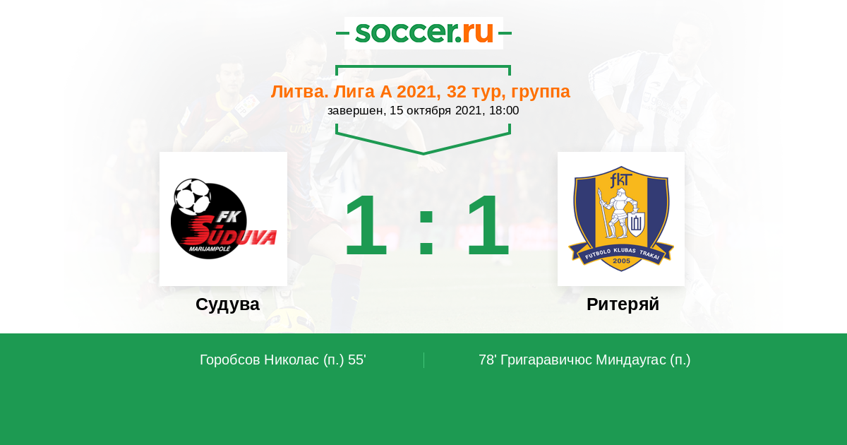 Литва. Лига А 25.06.2021 Ритеряй Логотип футбольный клуб Ритеряй (Тракай) 1:1 Логотип футбольный клуб Судува (Мариямполе) Судува