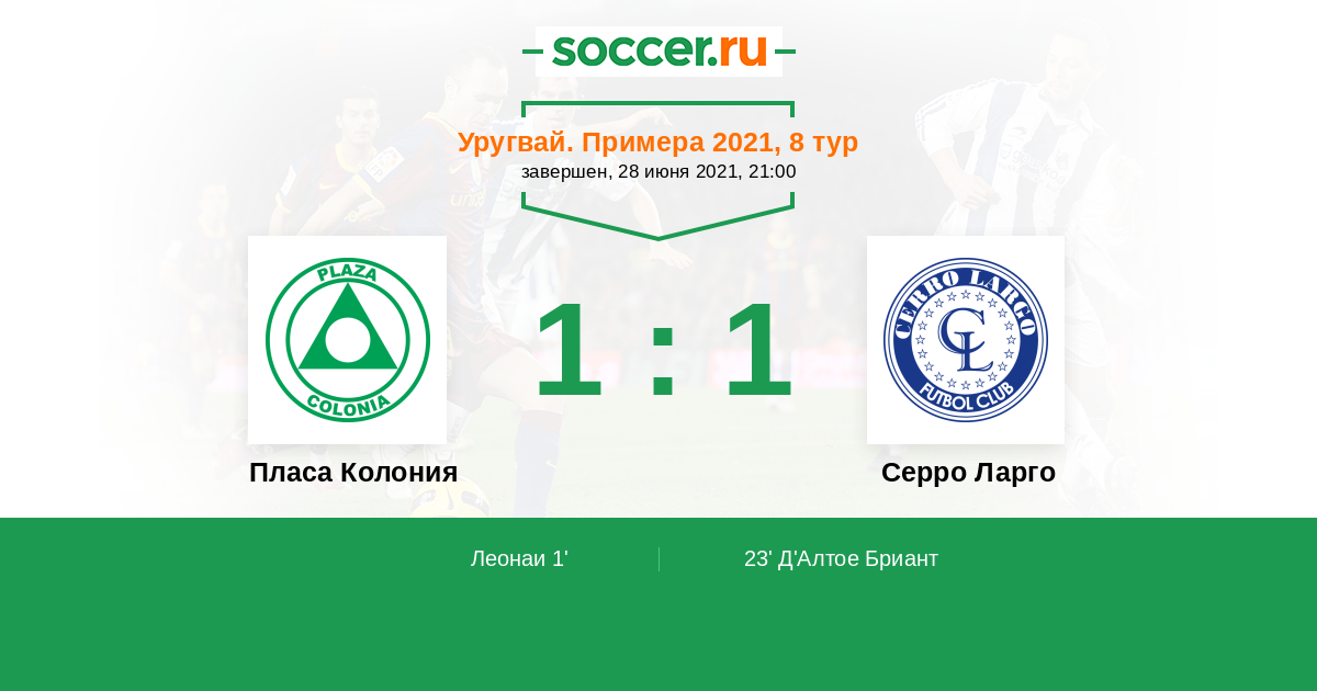 Уругвай. Примера A 21.06.2022 Серро Ларго Логотип футбольный клуб Серро Ларго (Мело) 1:0 Логотип футбольный клуб Пласа Колония (Колония-дель-Сакраменто) Пласа Колония