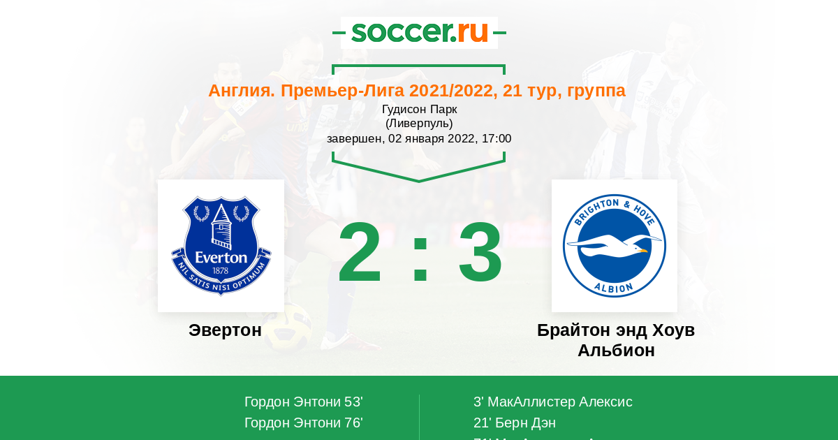 Англия. Премьер-Лига 28.08.2021 Брайтон энд Хоув Альбион Логотип футбольный клуб Брайтон энд Хоув Альбион 0:2 Логотип футбольный клуб Эвертон (Ливерпуль) Эвертон