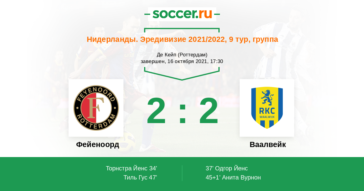 Нидерланды. Эредивизи 13.02.2022 Ваалвейк Логотип футбольный клуб Ваалвейк (Валвейк) 0:2 Логотип футбольный клуб Фейеноорд (Роттердам) Фейеноорд