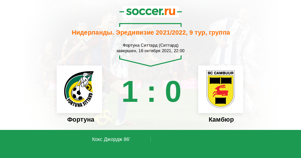 Нидерланды. Первый дивизион 16.09.2016 Фортуна Логотип футбольный клуб Фортуна (Ситтард) 3:0 Логотип футбольный клуб Камбюр (Лиуварден) Камбюр