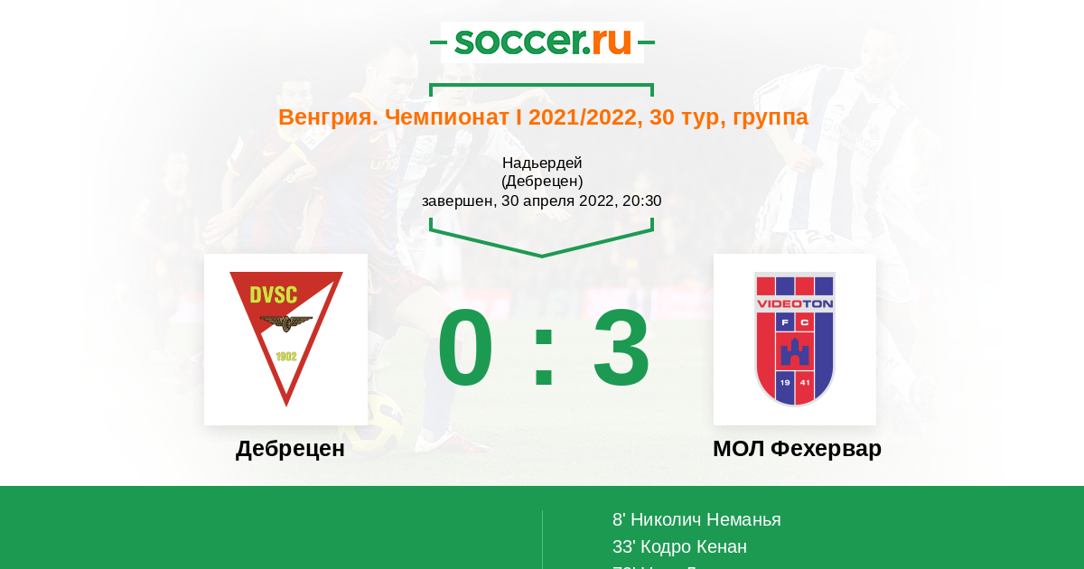 Венгрия. Чемпионат 1 30.04.2023 Дебрецен Логотип футбольный клуб Дебрецен 2:0 Логотип футбольный клуб МОЛ Фехервар (Секешфехервар) МОЛ Фехервар