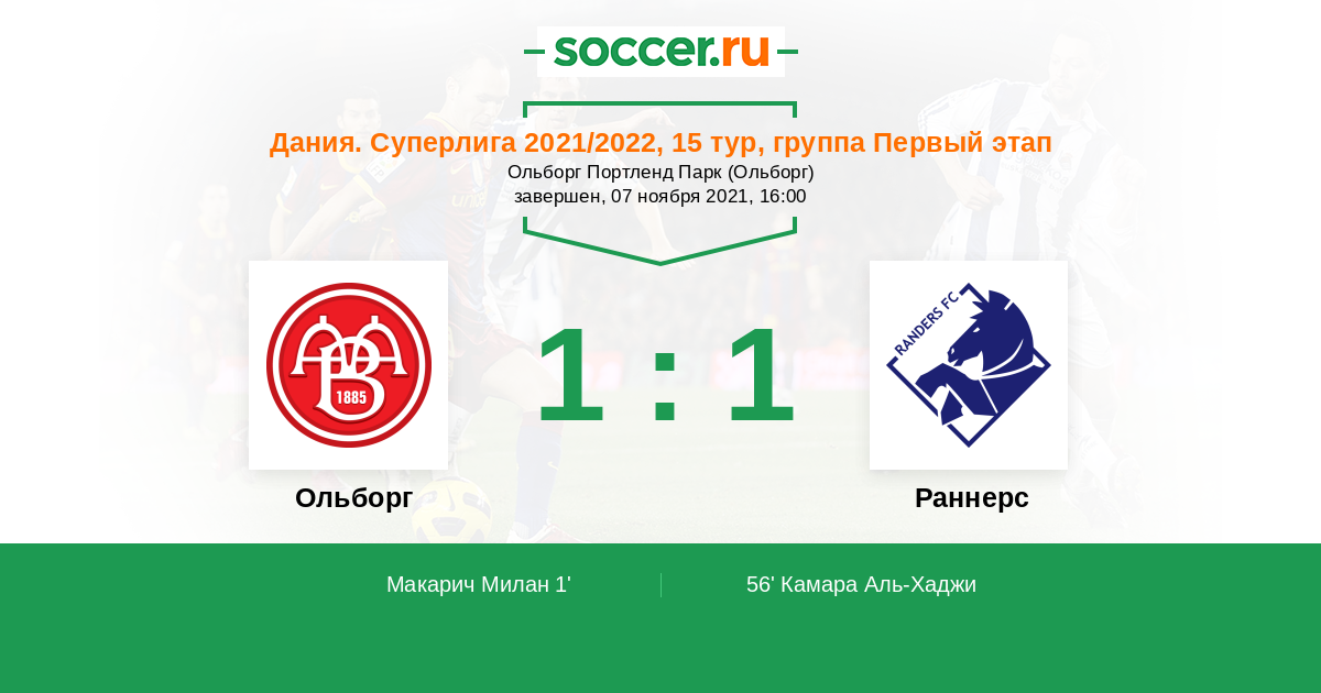 Дания. Суперлига 08.04.2022 Ольборг Логотип футбольный клуб Ольборг 3:0 Логотип футбольный клуб Раннерс Раннерс