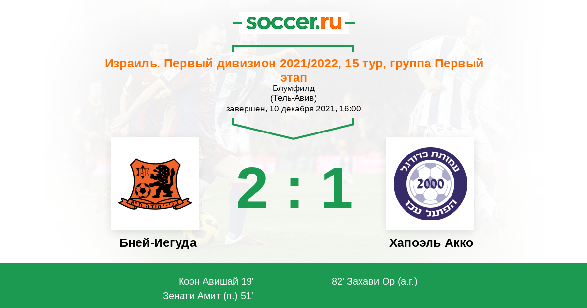 Израиль. Премьер-Лига 17.12.2011 Бней-Иегуда Логотип футбольный клуб Бней-Иегуда (Тель-Авив) 4:1 Логотип футбольный клуб Хапоэль Акко Хапоэль Акко