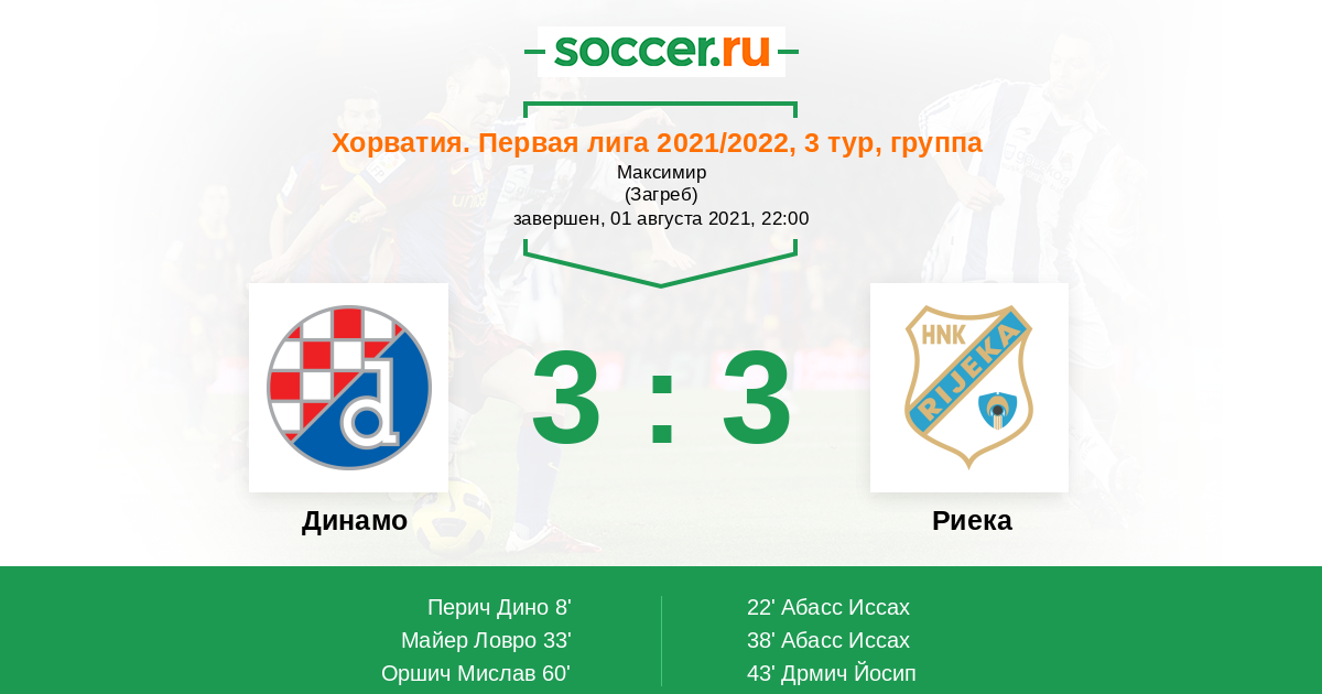 Хорватия. Первая лига 02.09.2022 Динамо Логотип футбольный клуб Динамо (Загреб) 3:1 Логотип футбольный клуб Риека Риека
