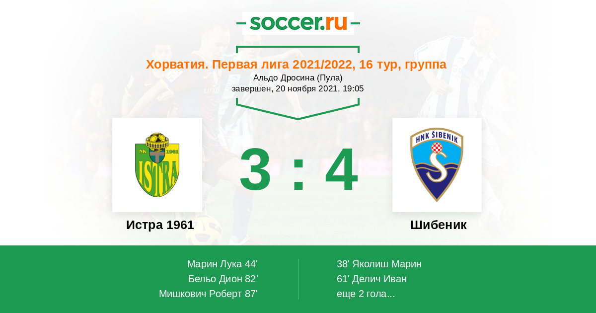 Хорватия. Первая лига 05.03.2021 Истра 1961 Логотип футбольный клуб Истра 1961 (Пула) 3:2 Логотип футбольный клуб Шибеник Шибеник