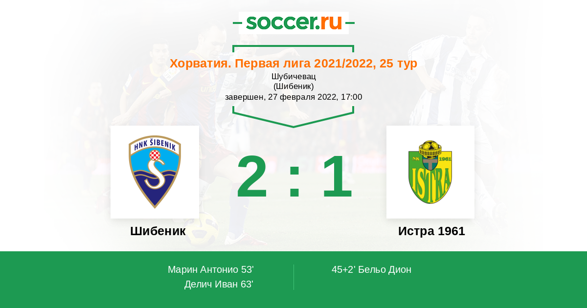 Хорватия. Первая лига 10.02.2021 Шибеник Логотип футбольный клуб Шибеник 1:0 Логотип футбольный клуб Истра 1961 (Пула) Истра 1961