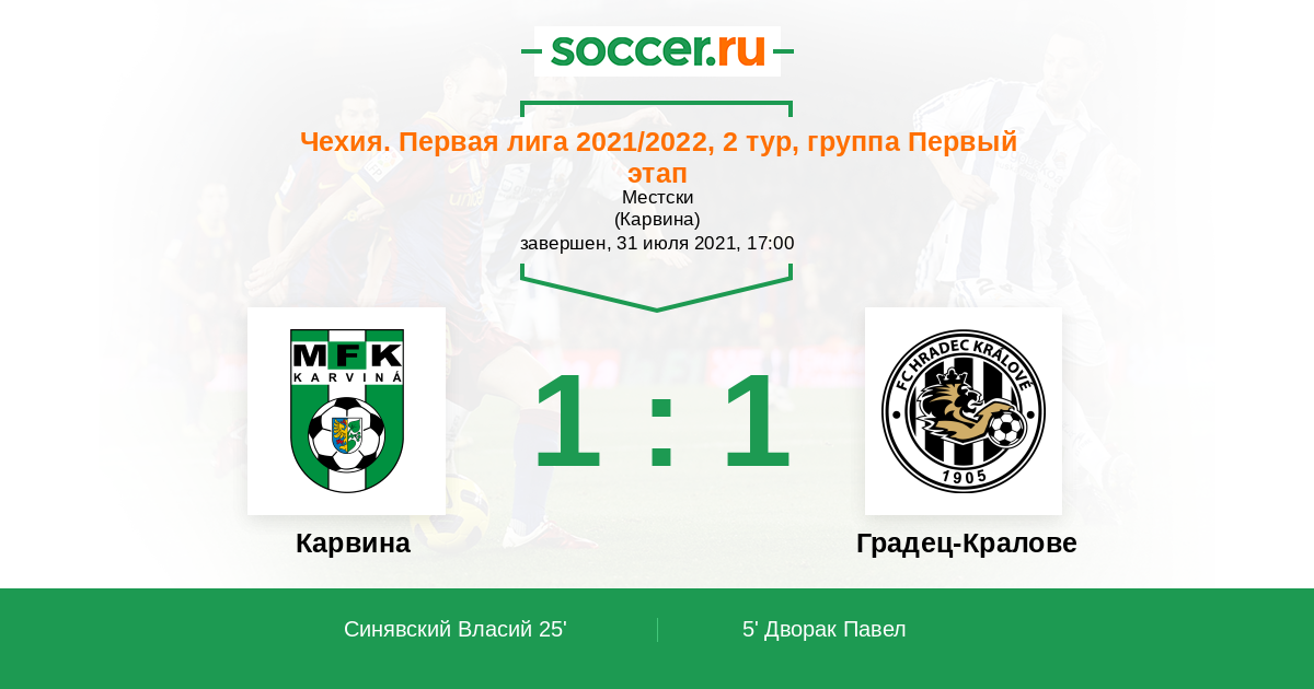 Чехия. Первая Лига 30.04.2017 Карвина Логотип футбольный клуб Карвина 4:2 Логотип футбольный клуб Градец-Кралове Градец-Кралове