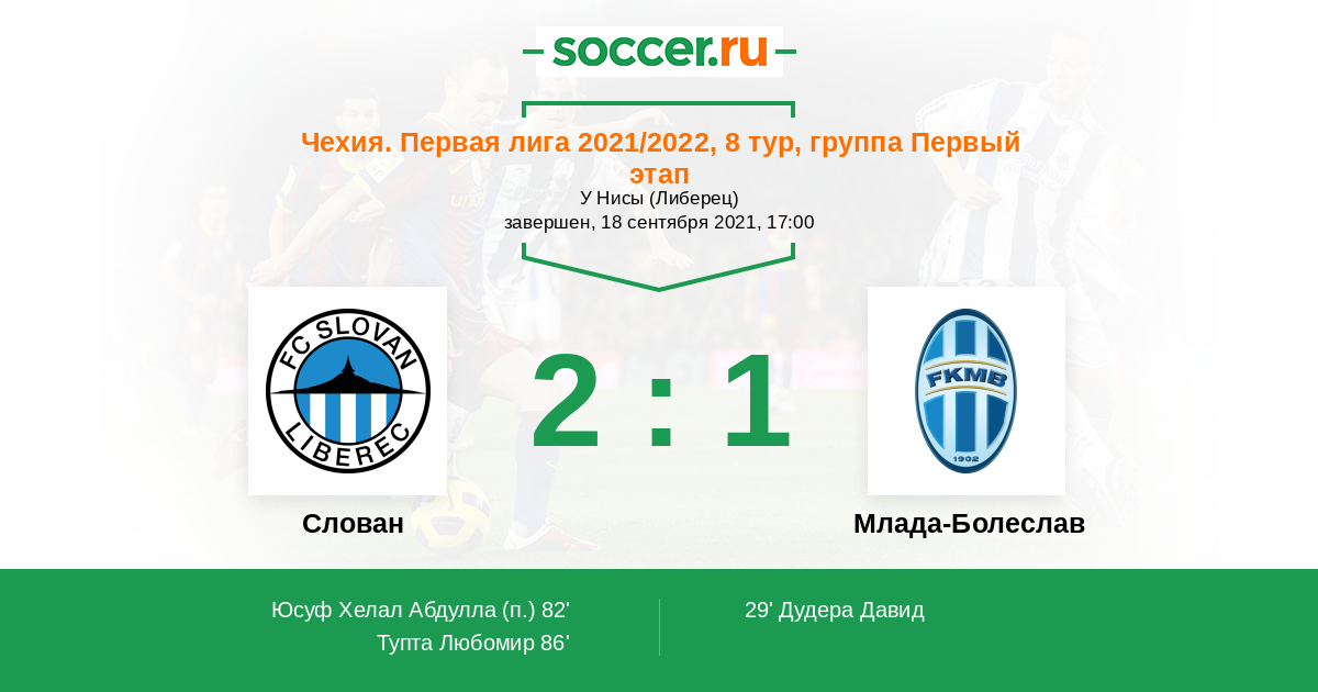 Чехия. Первая Лига 17.09.2022 Слован Логотип футбольный клуб Слован (Либерец) 1:3 Логотип футбольный клуб Млада-Болеслав Млада-Болеслав