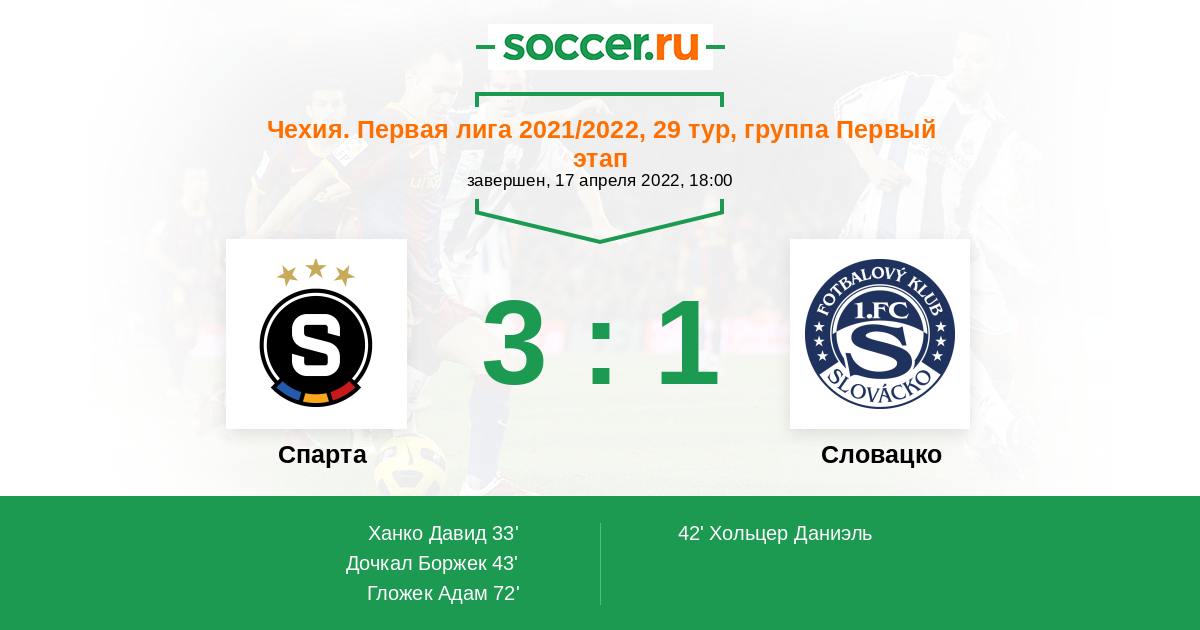 Чехия. Первая Лига 18.04.2021 Спарта Логотип футбольный клуб Спарта (Прага) 1:0 Логотип футбольный клуб Словацко (Угерске-Градиште) Словацко