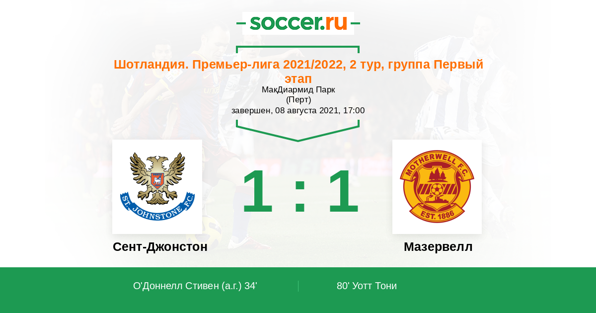 Шотландия. Премьер-Лига 19.03.2022 Сент-Джонстон Логотип футбольный клуб Сент-Джонстон (Перт) 2:1 Логотип футбольный клуб Мазервелл Мазервелл