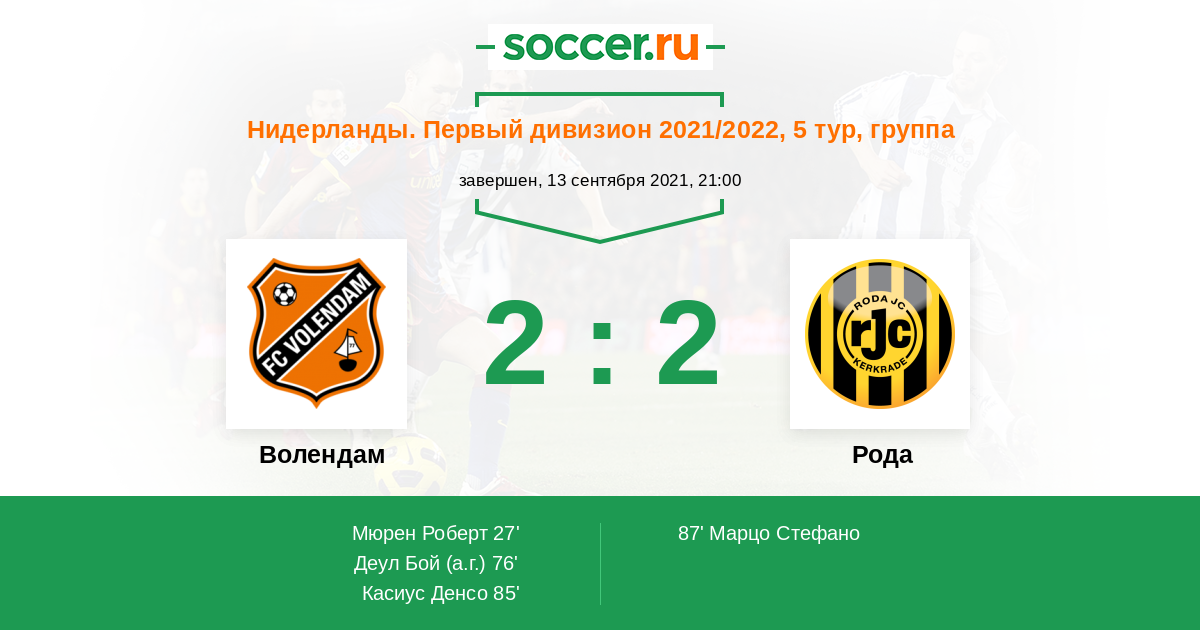 Нидерланды. Первый дивизион 07.02.2022 Рода Логотип футбольный клуб Рода (Керкраде) 1:1 Логотип футбольный клуб Волендам Волендам