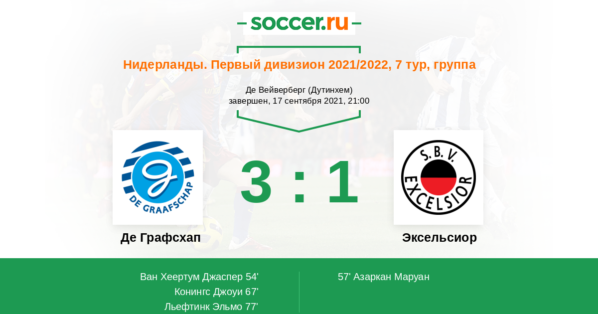 Нидерланды. Первый дивизион 19.03.2021 Де Графсхап Логотип футбольный клуб Де Графсхап (Дутинхем) 1:1 Логотип футбольный клуб Эксельсиор (Роттердам) Эксельсиор