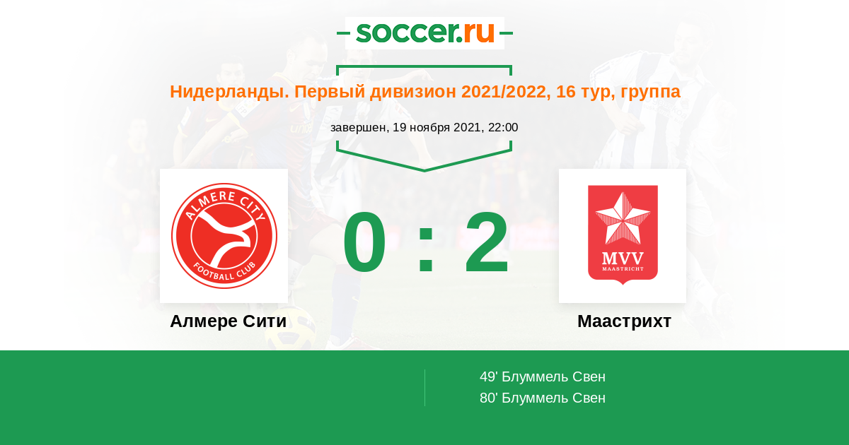 Нидерланды. Первый дивизион 19.11.2022 Маастрихт Логотип футбольный клуб Маастрихт 1:0 Логотип футбольный клуб Алмере Сити Алмере Сити