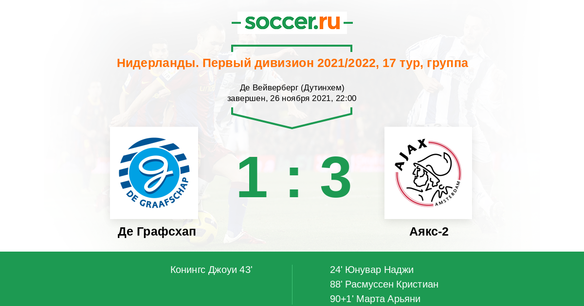 Нидерланды. Первый дивизион 16.03.2018 Де Графсхап Логотип футбольный клуб Де Графсхап (Дутинхем) 2:4 Логотип футбольный клуб Аякс-2 (Амстердам) Аякс-2