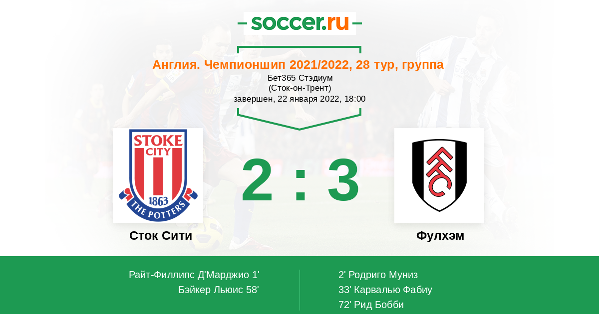 Англия. Чемпионшип 28.08.2021 Фулхэм Логотип футбольный клуб Фулхэм (Лондон) 3:0 Логотип футбольный клуб Сток Сити (Сток-он-Трент) Сток Сити
