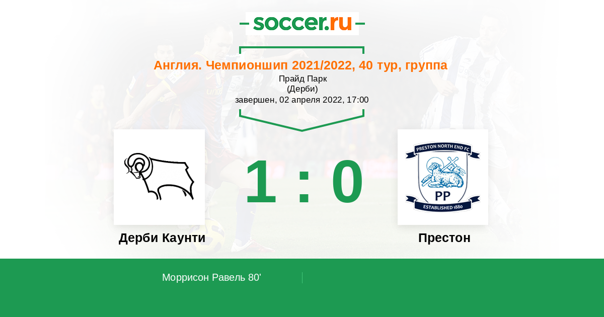 Англия. Чемпионшип 02.04.2018 Престон Логотип футбольный клуб Престон 0:1 Логотип футбольный клуб Дерби Каунти Дерби Каунти