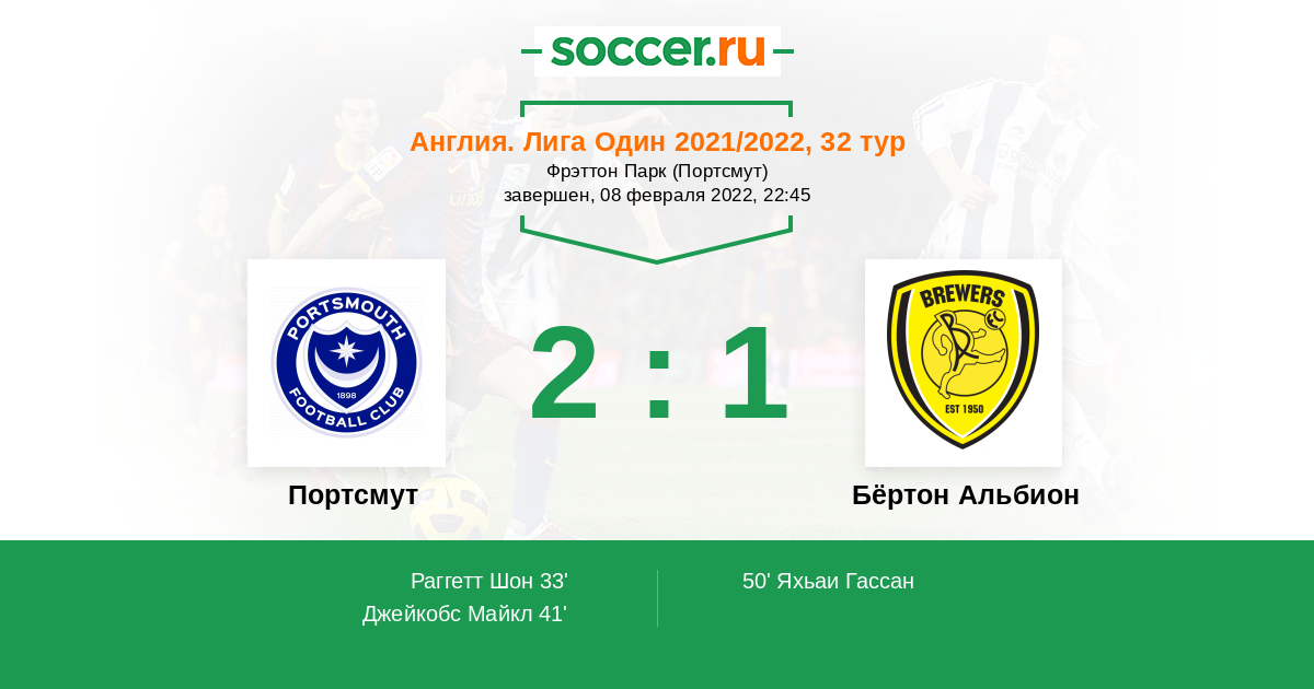 Англия. Первая Футбольная Лига 10.04.2021 Портсмут Логотип футбольный клуб Портсмут 1:2 Логотип футбольный клуб Бёртон Альбион (Бёртон-апон-Трент) Бёртон Альбион