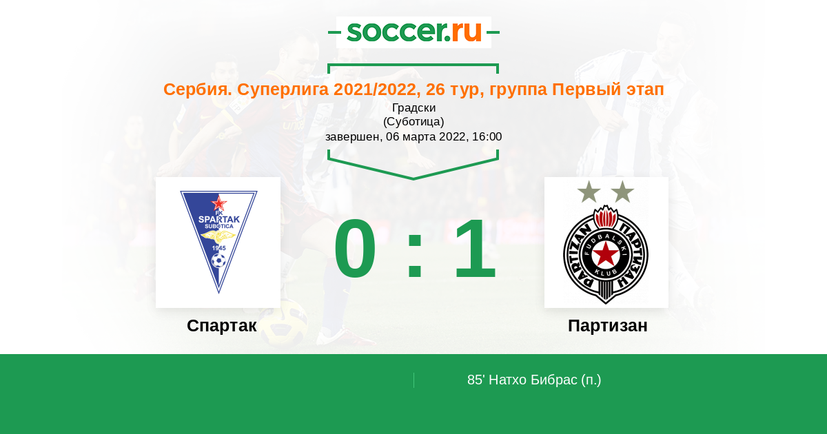 Сербия. Суперлига 03.04.2010 Партизан Логотип футбольный клуб Партизан (Белград) 2:0 Логотип футбольный клуб Спартак Суботица Спартак Суботица