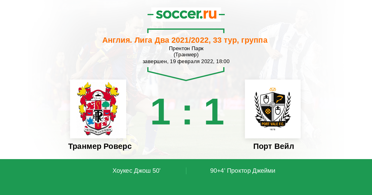 Англия. Вторая Футбольная Лига 19.02.2019 Порт Вейл Логотип футбольный клуб Порт Вейл (Сток-он-Трент) 1:2 Логотип футбольный клуб Транмер Роверс Транмер Роверс