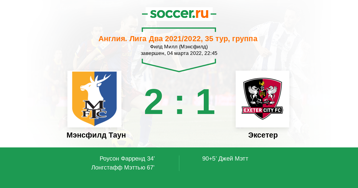 Англия. Вторая Футбольная Лига 23.10.2021 Эксетер Логотип футбольный клуб Эксетер 2:1 Логотип футбольный клуб Мэнсфилд Таун Мэнсфилд Таун