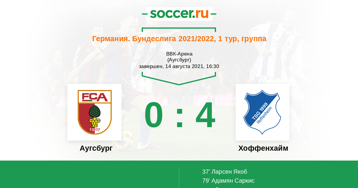 Германия. Бундеслига 20.08.2011 Аугсбург Логотип футбольный клуб Аугсбург 0:2 Логотип футбольный клуб Хоффенхайм (Зинсхайм) Хоффенхайм