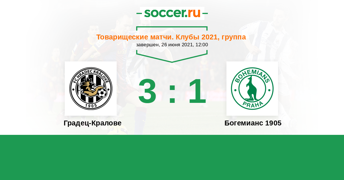 Товарищеские матчи. Клубы 23.06.2018 Богемианс 1905 Логотип футбольный клуб Богемианс 1905 (Прага) 7:2 Логотип футбольный клуб Градец-Кралове Градец-Кралове