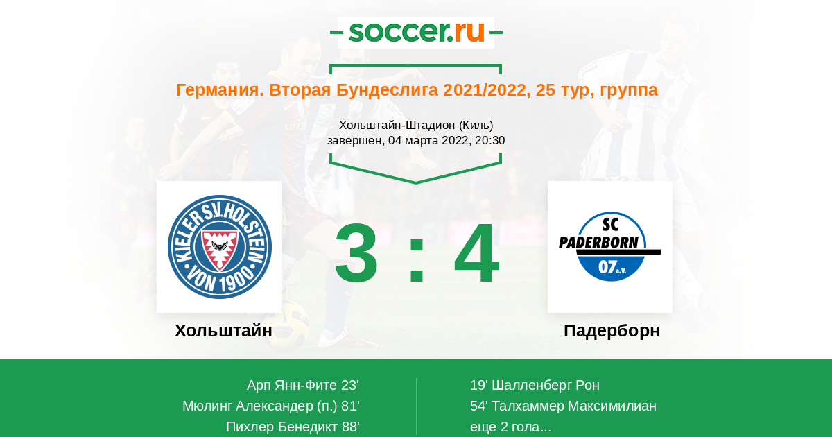 Германия. Бундеслига 2 25.02.2023 Хольштайн Логотип футбольный клуб Хольштайн (Киль) 1:1 Логотип футбольный клуб Падерборн Падерборн