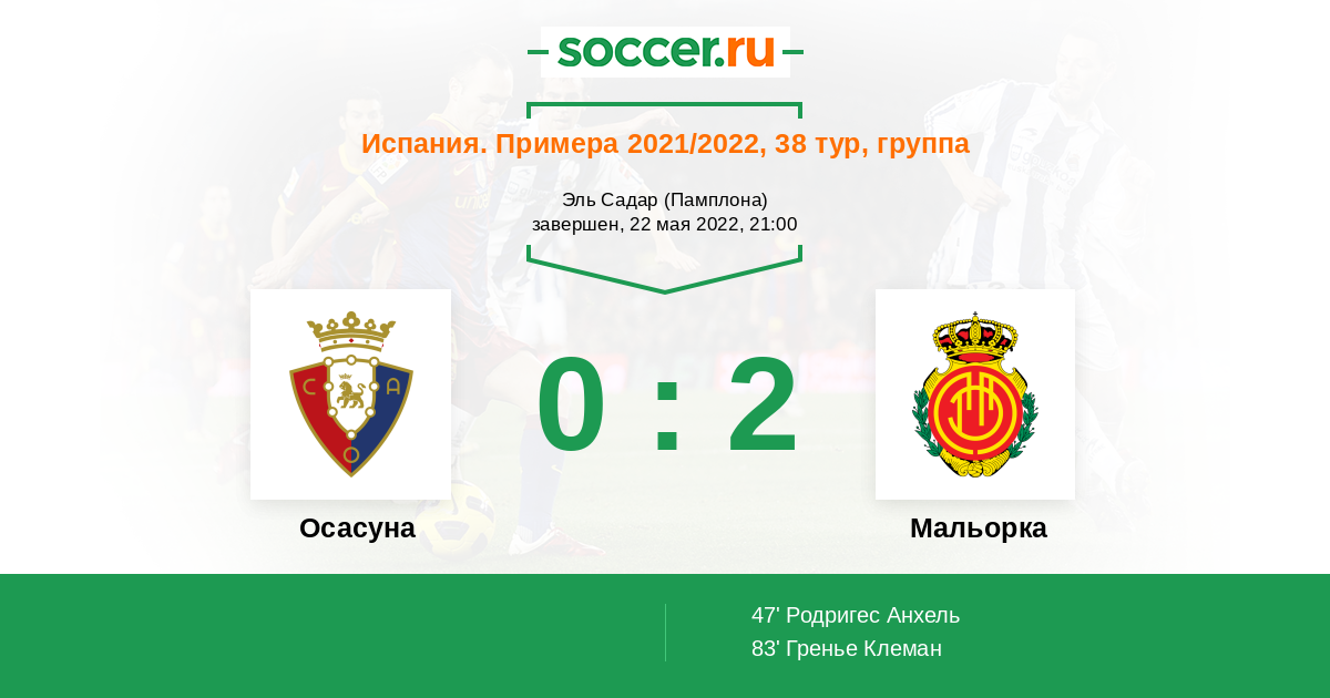 Испания. Примера 26.09.2021 Мальорка Логотип футбольный клуб Мальорка (Пальма-де-Мальорка) 2:3 Логотип футбольный клуб Осасуна (Памплона) Осасуна